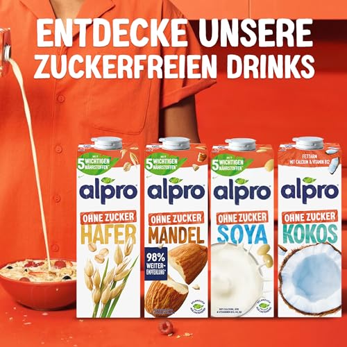 Alpro Mandeldrink Ohne Zucker – Quelle von Calcium und Vitaminen – Zuckerfrei, glutenfrei, fettarm, ohne Laktose, vegan und milchfrei – 8 x 1 L – Haltbar