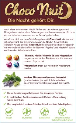 Choco Nuit 20 Beutel Schokogetränk zum Einschlafen mit natürlicher Gute-Nacht-Rezeptur - Magnesium, Hopfen, Melisse - vegan glutenfrei ohne Melatonin und künstliche Süßstoffe