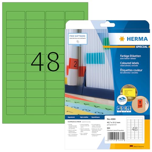 HERMA 4369 Farbige Etiketten grün ablösbar, 20 Blatt, 45,7 x 21,2 mm, 48 pro A4 Bogen, 960 Stück, selbstklebend, bedruckbar, matt, blanko Papier Farbetiketten Aufkleber