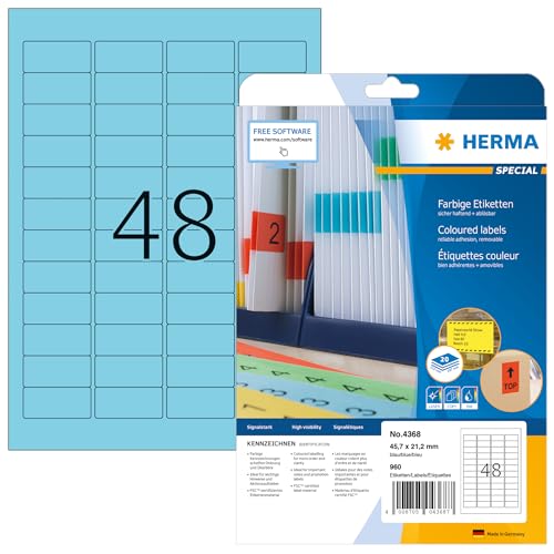 HERMA 4368 Farbige Etiketten blau ablösbar, 20 Blatt, 45,7 x 21,2 mm, 48 pro A4 Bogen, 960 Stück, selbstklebend, bedruckbar, matt, blanko Papier Farbetiketten Aufkleber