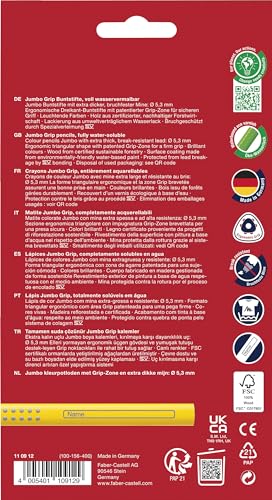 Faber-Castell 110912 Jumbo Grip Buntstifte für Kinder, 12er-Jumbo-Buntstifte-Set, Malstifte mit Grip und dreieckigem Schaft, wasserlöslichen Pigmenten, leicht auswaschbar und bruchsicher, Schulsachen