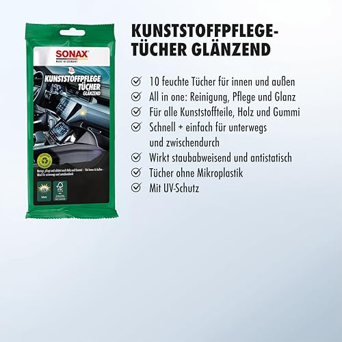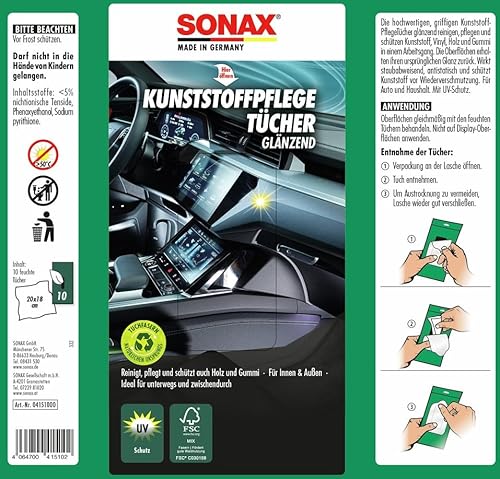 SONAX KunststoffPflegeTücher glänzend (10 Stück) Feuchte Tücher reinigen, pflegen und verleihen Glanz in einem Arbeitsgang | Art-Nr. 04151000