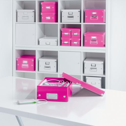 Leitz Click & Store Aufbewahrungsbox mit Deckel Mittel-Groß, Box für Unterlagen bis A4 im Büro u. Haushalt, Transportbox aus 85 % recycelter Premium-Hartpappe, Stabile Metallgriffe, Pink, 60440023