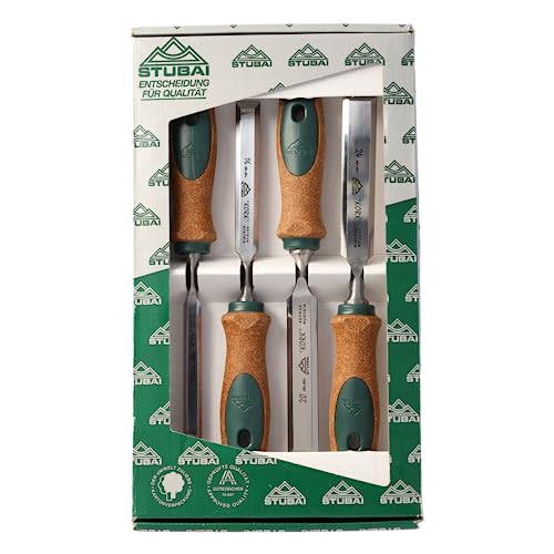 Stemmeisensatz Korkheft, 4-teiliges Set (12,16,20,24mm) Stemmeisen mit rutschfestem Korkgriff aus nachhaltiger Herstellung, Stubai Stechbeitel zur präzisen Holzbearbeitung, Spezial Stecheisen