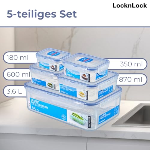 LocknLock PP Classic Vorratsdosen Set 5tlg., 180, 350, 600, 870ml, 3,6L, Vorratsdosen mit Deckel luftdicht & auslaufsicher, Gefrier-, Spülmaschinen- & Mikrowellengeeignete Aufbewahrungsboxen Küche