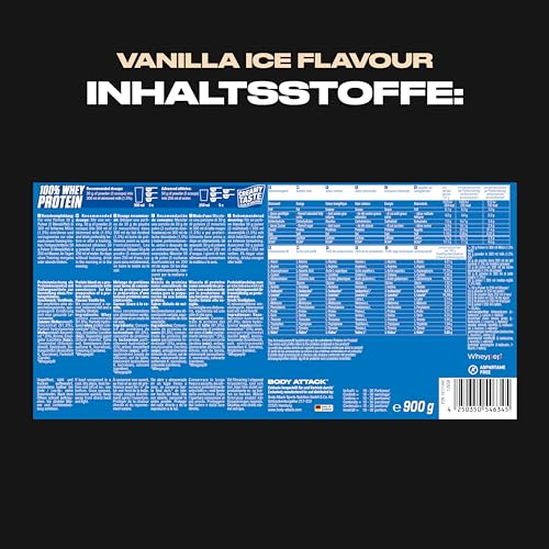 Body Attack 100% Whey Protein - Vanilla Ice - 900 g - Made in Germany - Extra cremiges Eiweißpulver mit Hydrolysat & BCAA´s, unterstützt Muskelaufbau und Diäten - Für Sportler & Athleten