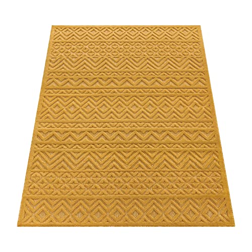 Paco Home Outdoor Teppich wetterfest & langlebig Moderne Boho-Designs mit 3D-Effekt Skandi-Look UV-beständig & robust für Balkon, Garten, Wohnzimmer & Küche, Grösse:160 cm Rund, Farbe:Gelb
