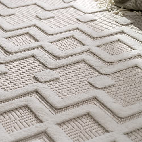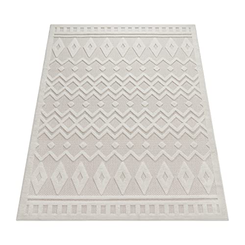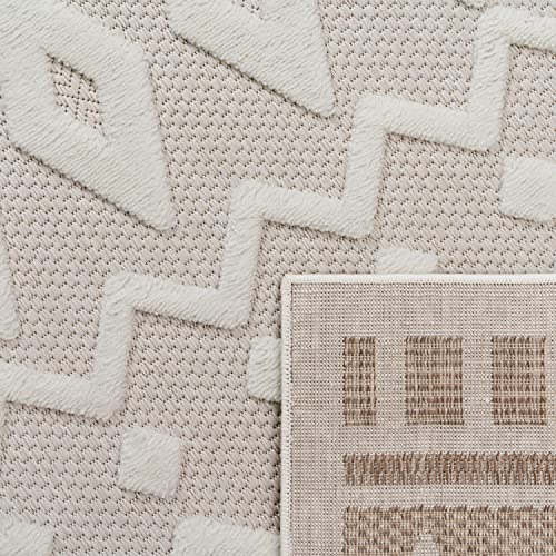 Paco Home Outdoor Teppich wetterfest & langlebig Moderne Boho-Designs mit 3D-Effekt Skandi-Look UV-beständig & robust für Balkon, Garten, Wohnzimmer & Küche, Grösse:160 cm Rund, Farbe:Creme 3