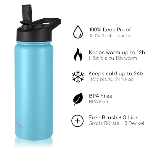 Milu Edelstahl Trinkflasche 500ml 750ml 1000ml (+3 Deckel) - Thermosflasche mit Strohhalm, Isolierte Wasserflasche, Auslaufsichere Isolierflasche doppelwandig, Kohlensäure geeignet (Himmelblau, 500ml)