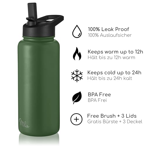 Milu Edelstahl Trinkflasche 500ml 750ml 1000ml (+3 Deckel) - Thermosflasche mit Strohhalm, Isolierte Wasserflasche, Auslaufsichere Isolierflasche doppelwandig, Kohlensäure geeignet (Olivgrün, 1000ml)