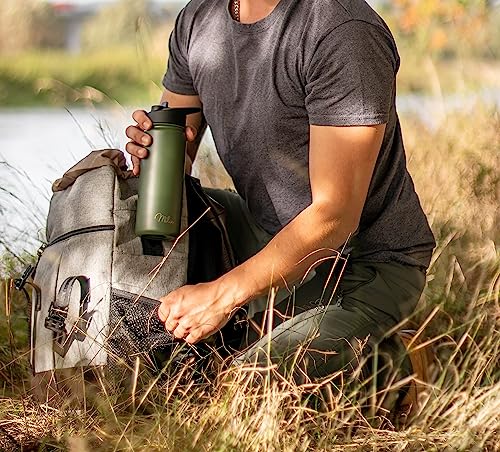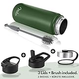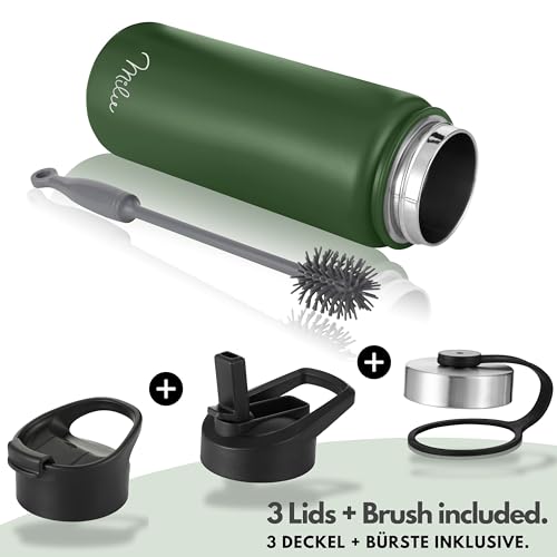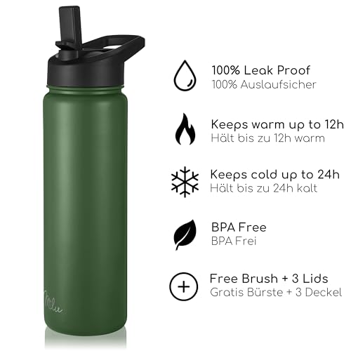 Milu Edelstahl Trinkflasche 500ml, 750ml, 1000ml (+3 Deckel) - Thermosflasche mit Strohhalm, Isolierte Wasserflasche, Auslaufsichere Isolierflasche doppelwandig, Kohlensäure geeignet (Olivgrün, 750ml)