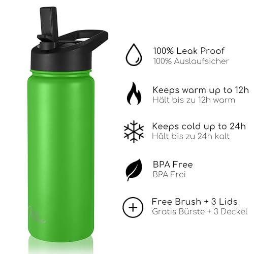 Milu Edelstahl Trinkflasche 500ml 750ml 1000ml (+3 Deckel) - Thermosflasche mit Strohhalm, Isolierte Wasserflasche, Auslaufsichere Isolierflasche doppelwandig, Kohlensäure geeignet (Apfelgrün, 500ml)