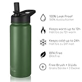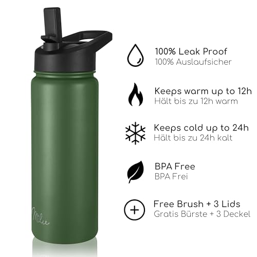 Milu Edelstahl Trinkflasche 500ml, 750ml, 1000ml (+3 Deckel) - Thermosflasche mit Strohhalm, Isolierte Wasserflasche, Auslaufsichere Isolierflasche doppelwandig, Kohlensäure geeignet (Olivgrün, 500ml)