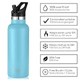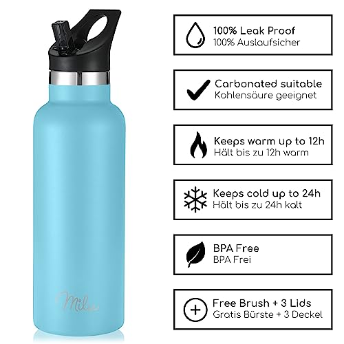 Milu Edelstahl Trinkflasche 350ml 500ml 750ml 1000ml (+3 Deckel) - Thermosflasche mit Strohhalm, Isolierte Wasserflasche, Auslaufsichere Isolierflasche doppelwandig (Himmelblau, 500ml)
