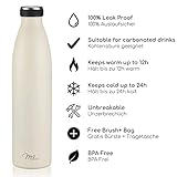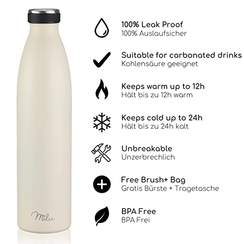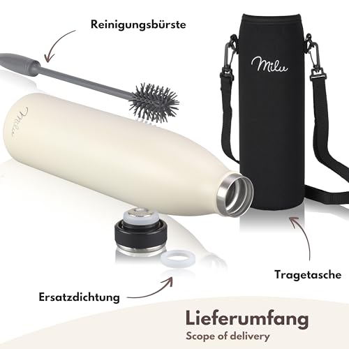Milu Edelstahl Trinkflasche 350ml 500ml 750ml 1L 1,5L Thermosflasche Isolierte Wasserflasche Auslaufsichere Isolierflasche doppelwandig Kohlensäure geeignet – inkl. Reinigungsbürste (Buttercream, 1L)
