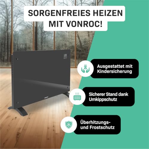 VONROC Luxury electric heater - Konvektorheizung - Mit Glasscheibe - 1000W/2000W - Beheizt Räume bis zu 24m2 - Gesteuert mit App (über Wifi) oder manuell - Einstellbarer Thermostat und Timer - Grau