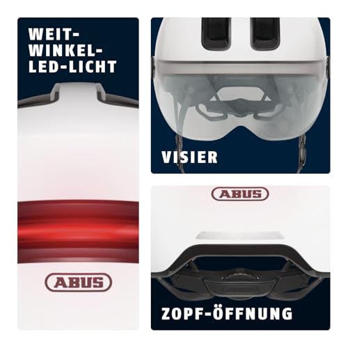 ABUS Stadthelm HUD-Y ACE - stylischer Fahrradhelm mit Visier und magnetischem, aufladbarem LED-Rücklicht - für Damen und Herren - Weiß Glänzend, Größe M