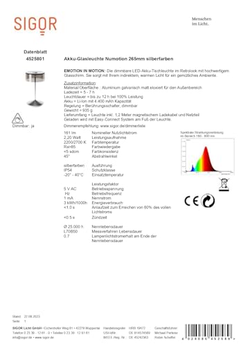 SIGOR Akku-Glasleuchte Numotion 265mm silberfarben Tischleuchte 2,2W FlexMood 22