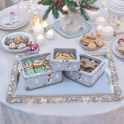 Spetebo Metall Gebäckdose mit Sichtfenster 3er Set eckig - 21/17 / 15 cm - Weihnachts Plätzchen Vorratsdose mit Schneemann Motiv - Keksdose Plätzchendose Aufbewahrung Geschenkbox