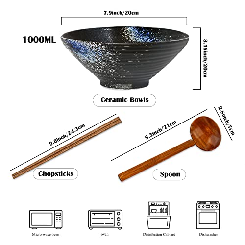 Sosayet Ramen Schüssel Keramik, 2 Sets Ramen Bowl mit Löffel und Essstäbchen, Rutschfeste Japanische Schüssel Geschirr für Ramen, Salat, Müsli, 1000 ml, 20 x 20 x 8 cm