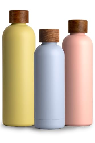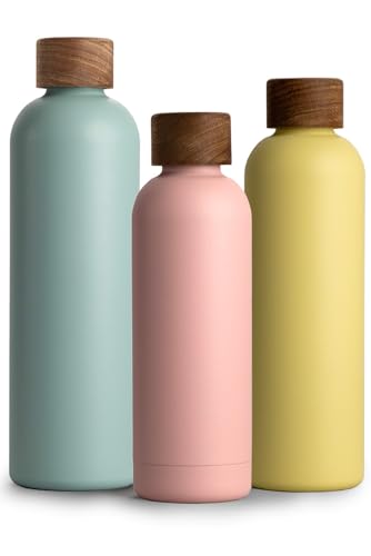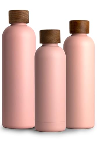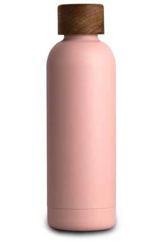 T&N Edelstahl Trinkflasche 500ml, Thermosflasche 0.5l mit Akazienholz Deckel, Isolierte Wasserflasche auslaufsicher bei Kohlensäure, Isolierflasche 500 ml - Nude