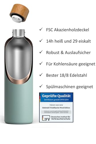 T&N Edelstahl Trinkflasche 500ml, Thermosflasche 0.5l mit Akazienholz Deckel,...