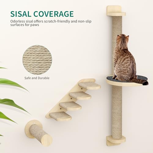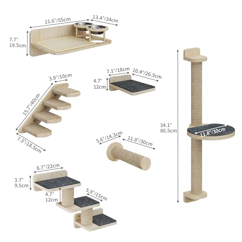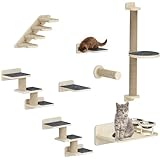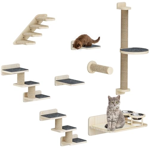 YITAHOME 8PCS Kletterwand Katzen, Katzenwandmöbel mit 1 Katzentreppe/2 Plattformen und 2 Leitern mit rutschfesten Matten/1 Sisalpfosten mit großer Plattform/Katzenbett mit 2 Katzennäpfen