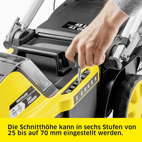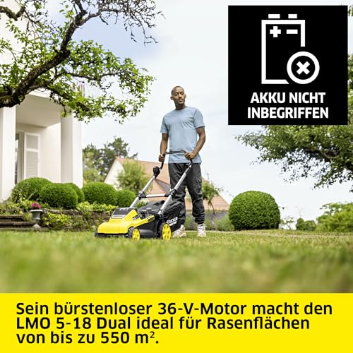 Kärcher Akku-Rasenmäher LMO 5-18 Dual, ideal für Grasflächen bis zu 550 m2, Schnittbreite: 41 cm, Motor: 36 V, Grasfangbehälter: 45 l, verwendbar mit 2 Kärcher 18-V-Akkus, ohne Akkus