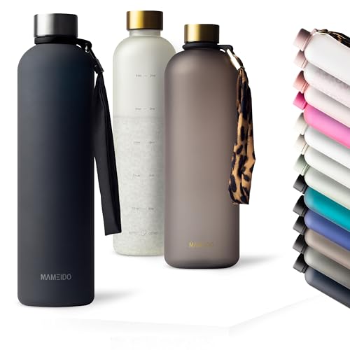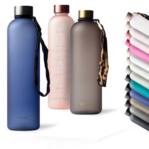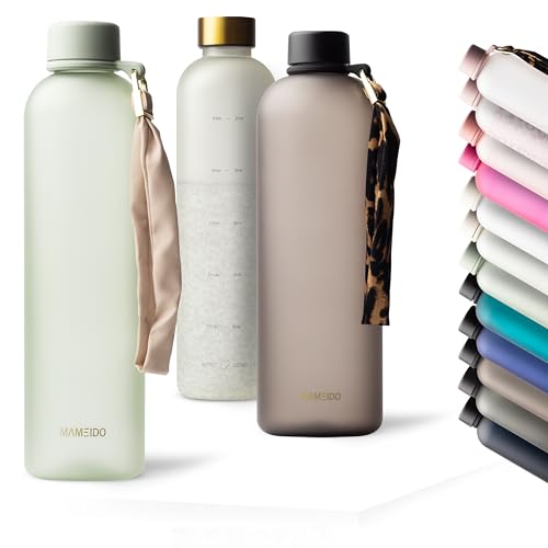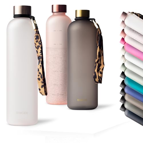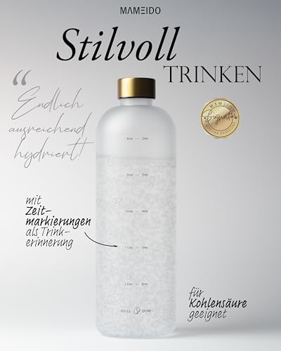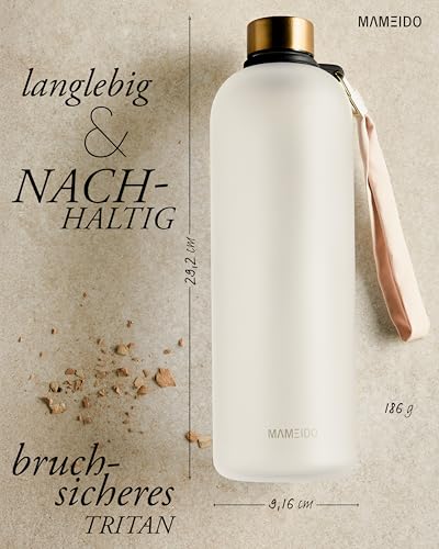MAMEIDO Trinkflasche mit Zeitmarkierung 1,5 l Kohlensäure geeignet, auslaufsichere Water Bottle, Wasserflasche BPA frei für Sport, Gym & Büro (Frosted White Gold)