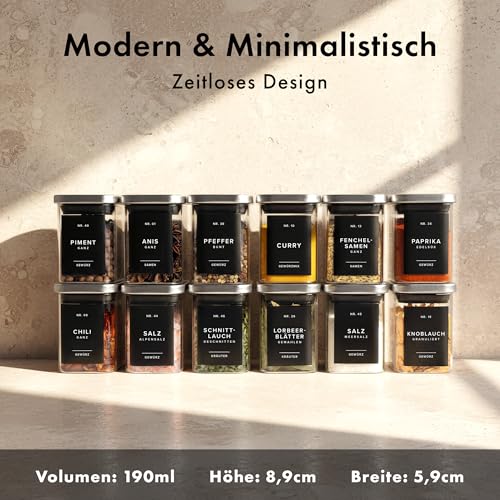 EDELHAUS Gewürzgläser Eckig mit Edelstahl Deckel 190ml (12 Stück) - Gewürzdosen Set mit 160 Gewürzetiketten/Luftdichte Vorratsdosen, Stapelbare Gewürz Organizer, Glasbehälter