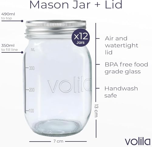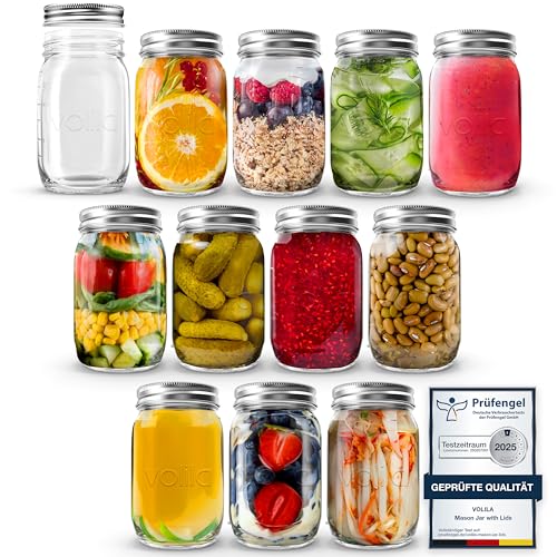 volila Mason Jar mit Deckeln - 490 ml Mehrzweck-Einmachgläser für Overnight Oats, Einlegen, Einmachen, Konservieren und Mahlzeitenvorbereitung - Luftdichte Einweckgläser (12er Pack - Normaler Deckel)