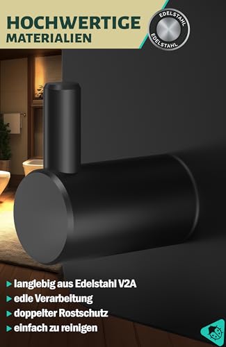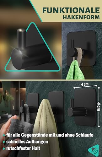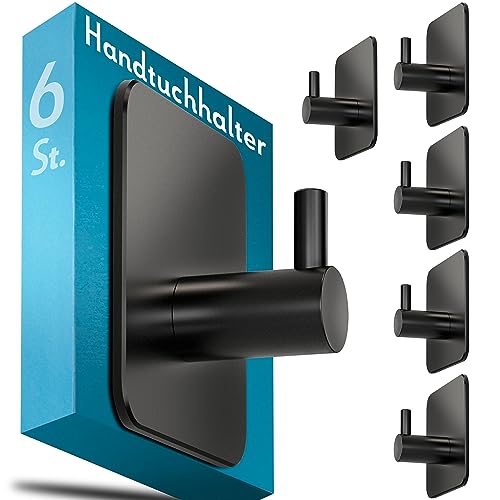 Menz Handtuchhalter ohne Bohren, 6 Stück, schwarz - Edelstahl Badezimmer Handtuchhalter, wasserfeste Klebehaken, langlebige Haken fürs Bad, Haken selbstklebend, ideal als funktionale Handtuchhaken