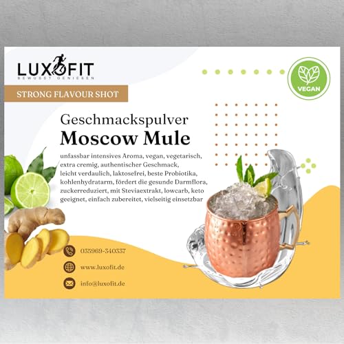 Luxofit STRONG FLAVOUR SHOT Kalorienarmes Geschmackspulver vielseitig einsetzbar für Lebensmittel, Vegan, Zuckerreduziert, Geschmacksvielfalt, Aromatisches Pulver (Moscow Mule)