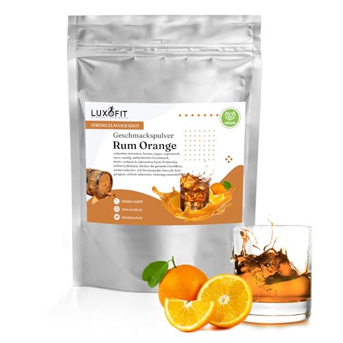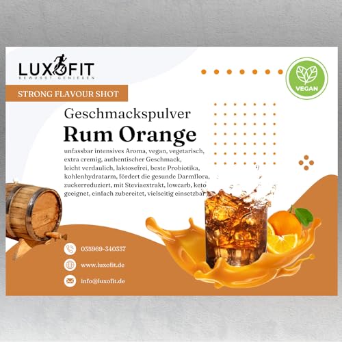 Luxofit STRONG FLAVOUR SHOT Kalorienarmes Geschmackspulver vielseitig einsetzbar für Lebensmittel, Vegan, Zuckerreduziert, Geschmacksvielfalt, Aromatisches Pulver (Rum Orange)
