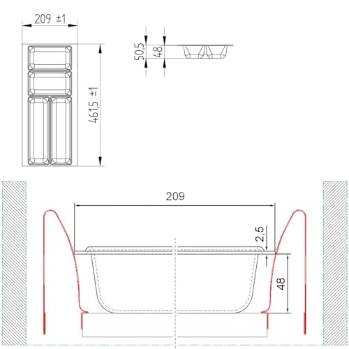 SO-TECH Orga-box 2 Besteckeinsatz Tiefe 462 mm für Nobilia Küchen Canvas-Struktur silbergrau Schubladeneinsatz Breite 209 mm für Schubladen 300 mm