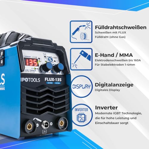 IPOTOOLS FLUX-135 Fülldraht Schweißgerät ohne Gas - 135 A FLUX Inverter Schweißgerät ohne Gas für Schweissgerät Fülldraht 0.8mm oder 1.