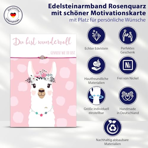 Glücksschmiedin – Edelstein Armband mit Rosenquarz & Goldperlen – Heilstein für Liebe & Selbstliebe – Geschenk-Set mit süßer Lama-Grußkarte – Handgefertigt in Deutschland