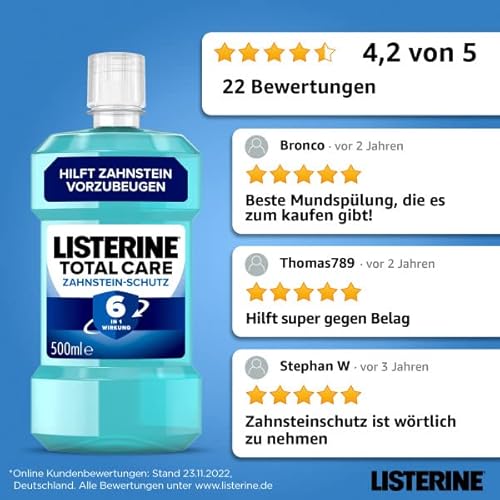 LISTERINE Total Care Zahnstein-Schutz (500 ml), schützende Mundspülung gegen Zahnstein mit 6 in 1 Wirkung, antibakterielles Mundwasser schützt vor Zahnfleischproblemen, bis zu 24h frischer Atem