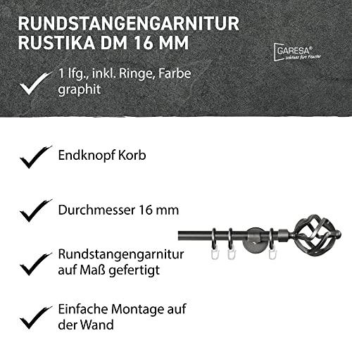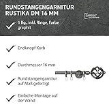 Gardinenstange GARESA RUSTIKA, grau (graphit), L:160cm Ø:16mm, Metall, Gardinenstangen, rustikale Vorhanggarnitur, verlängerbar, m. Ringe, Endknopf Korb