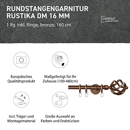 Garesa Gardinenstange Rustika Ø 16mm, 1-läufig, Bronze I Rustikale Vorhangstange aus Metall inkl. Ringe + Faltenlegehaken I Mit Endknopf Korb I 160cm