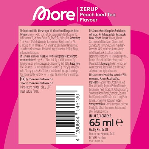 MORE Zerup, Peach Iced Tea, 65 ml, für bis zu 8 l Fertiggetränk, zuckerfreier Sirup mit echten Fruchtextrakten, vegan, zero Kalorien - made in Germany