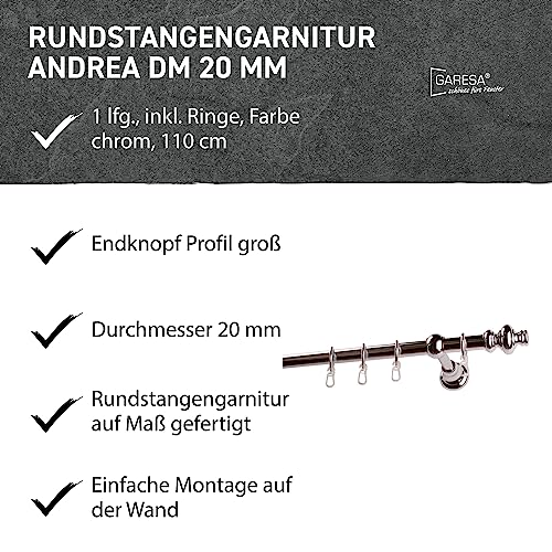 Garesa Gardinenstange Andrea Ø 20mm, 1-läufig, Chrom I Stabile Vorhangstange inkl. Ringe + Faltenlegehaken I Mit Endknopf Profil groß I 110cm