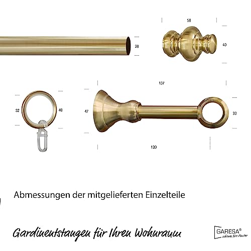 Gardinenstange GARESA ANDREA, gold (mattmessingfarben), L:120cm Ø:20mm, Metall, Gardinenstangen, Vorhanggarnitur, verlängerbar, Endknopf Profil groß, mit Ringen