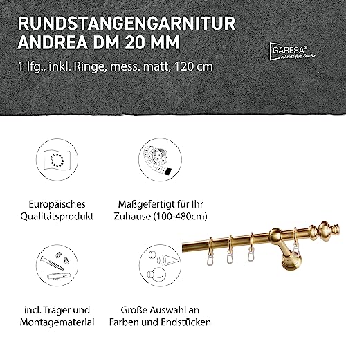Garesa Gardinenstange Andrea Ø 20mm, 1-läufig, Messing, matt I Stabile Vorhangstange inkl. Ringe + Faltenlegehaken I Mit Endknopf Profil groß I 120cm