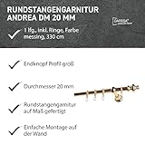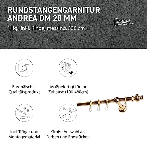 Garesa Gardinenstange Andrea Ø 20mm, 1-läufig, Messing I Stabile Vorhangstange inkl. Ringe + Faltenlegehaken I Mit Endknopf Profil groß I 330cm