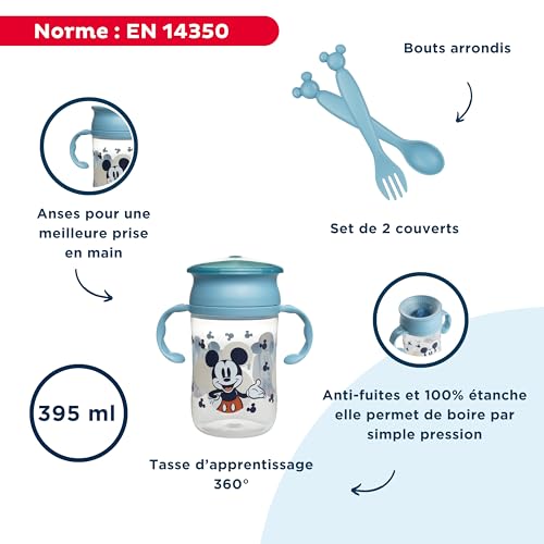 Disney Mickey Kindergeschirr-Set – unterteilter Teller – Schüssel – Löffel – Gabel und Tasse 360° – lustiges und praktisches Design für Baby-Mahlzeiten