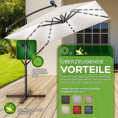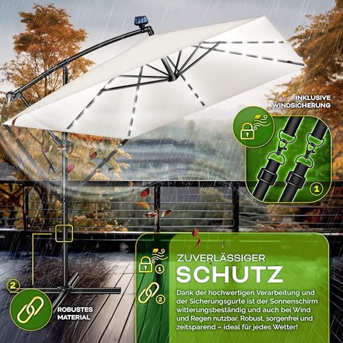 tillvex® Alu Sonnenschirm Rechteckig Ø 330 cm mit LED Solar Beige + Abdeckung mit Kurbel | Ampelschirm mit Ständer & Windschutz | Gartenschirm UV-Schutz, wasserdicht, 360° drehbar | Kurbelschirm Marktschirm TVESNS-010