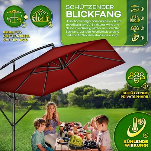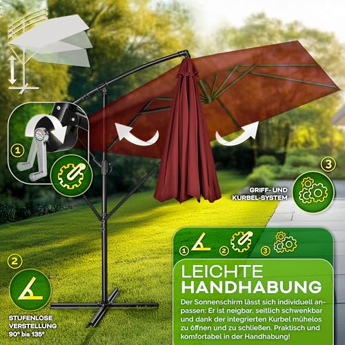 TILLVEX Alu Sonnenschirm Rechteckig ø 330 cm Rot + Abdeckung mit Kurbel Ampelschirm Eckig mit Ständer & Windschutz Gartenschirm UV-Schutz Aluminium