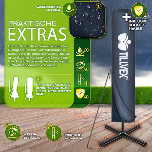 tillvex® Alu Sonnenschirm Rechteckig Ø 330 cm + Abdeckung mit Kurbel | Ampelschirm Eckig mit Ständer & Windschutz | Gartenschirm UV-Schutz Aluminium | Kurbelschirm Marktschirm wasserdicht 360° drehbar