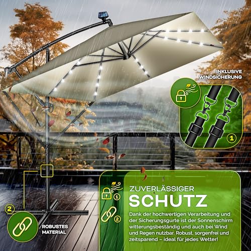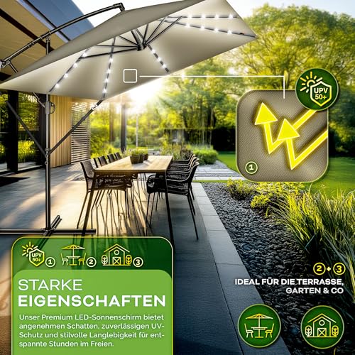 tillvex® Alu Sonnenschirm Rechteckig Ø 330 cm mit LED Solar + Abdeckung mit Kurbel | Ampelschirm mit Ständer & Windschutz | Gartenschirm UV-Schutz, wasserdicht, 360° drehbar | Kurbelschirm Marktschirm